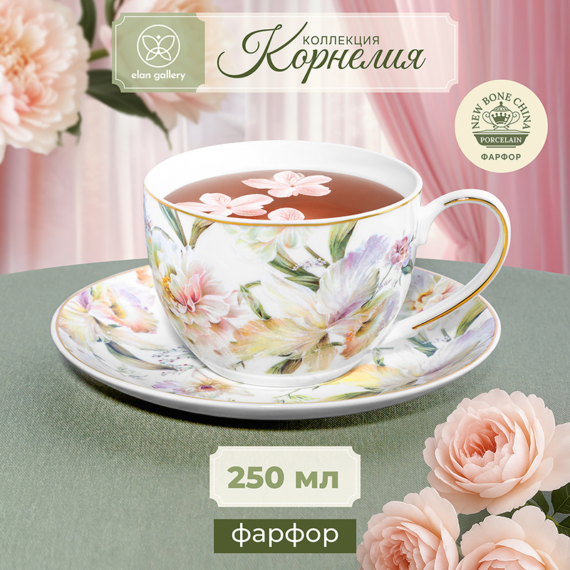 Компания «Элан Галерея» представила новую коллекцию фарфоровой посуды «Корнелия». Цветочный рисунок вдохновлен техникой акварели. Тонкая золотистая окантовка служит деликатным акцентом и подчёркивает изысканность. В коллекции представлены чайные пары, наборы для чаепития на несколько персон и кружки на металлической подставке.
