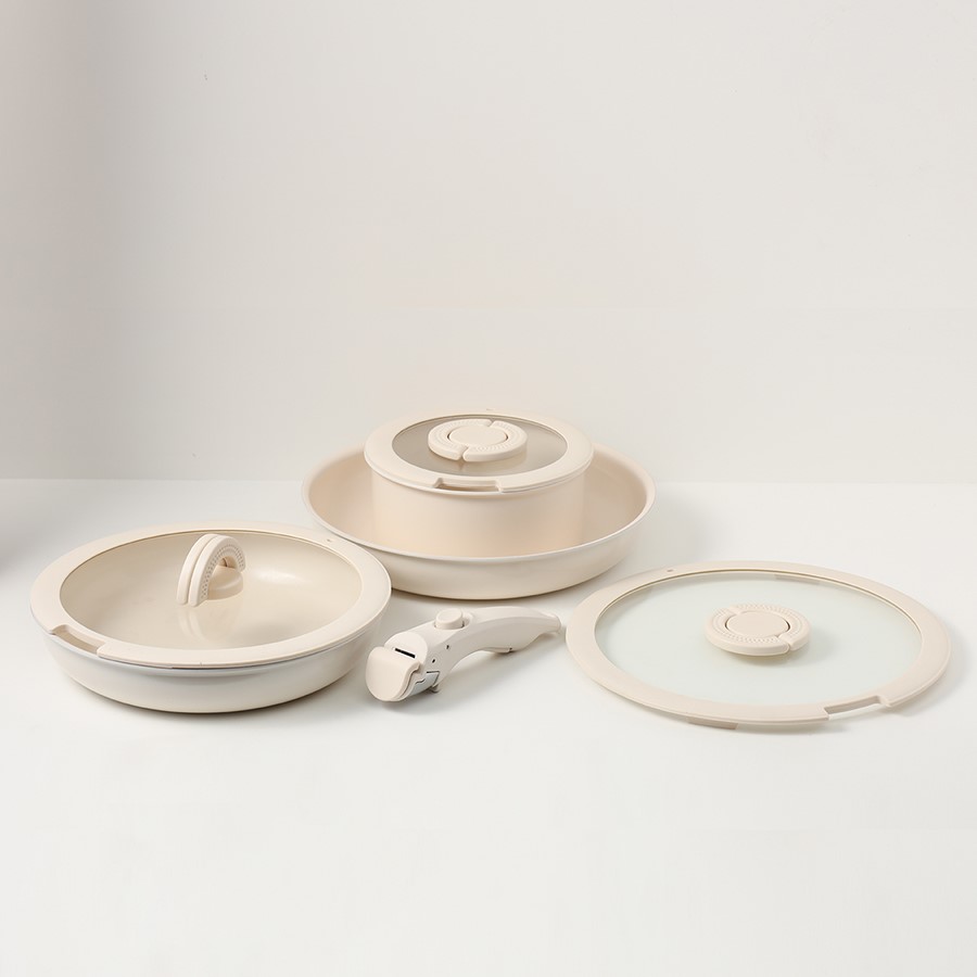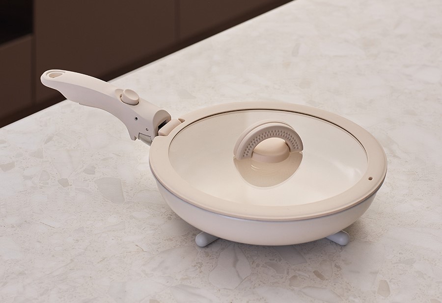 Каталог компании Finedesigngroup пополнился набором посуды для приготовления Smart Ceramic. Посуда изготовлена из алюминия с керамическим покрытием цвета топленого молока. В набор входят 2 сковороды и ковш. Изделия оснащены одной съемной ручкой из бакелита с покрытием Soft Touch и крышками из закаленного стекла. На крышках предусмотрены специальные ручки из нейлона, которые не нагреваются и легко складываются для компактного хранения.