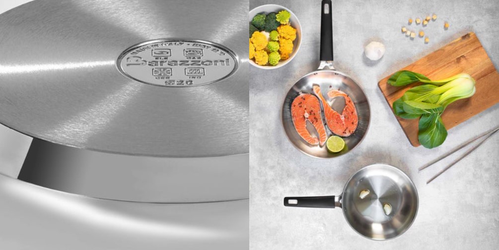 Итальянский бренд Barazzoni представил коллекцию посуды 33 Carati. Посуда выполнена из нержавеющей стали 18/10, оснащена эргономичной ручкой из силикона. Сковороды подходят для медленного тушения, жарки и приготовления на всех типах варочных панелей, а также в духовке до 230°. Кроме сковород в коллекцию вошли кастрюли и вок.