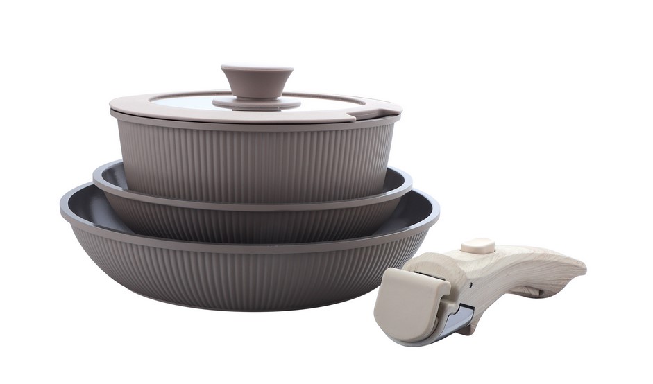 В ассортименте компании «Пилот МС» представлен новый набор литой антипригарной посуды 5-в-1 серии «Дюна» от ТМ Appetite. Посуда сочетает стильный дизайн и практичность. Изготовлена из литого алюминия с покрытием PFLUON. В комплект входят сковороды 20 и 26 см, глубокий ковш с крышкой 18 см и съемная бакелитовая ручка с эргономичным держателем. Посуда подходит для использования на индукционной, электрической, керамической и газовой плите, а также для запекания в духовке.