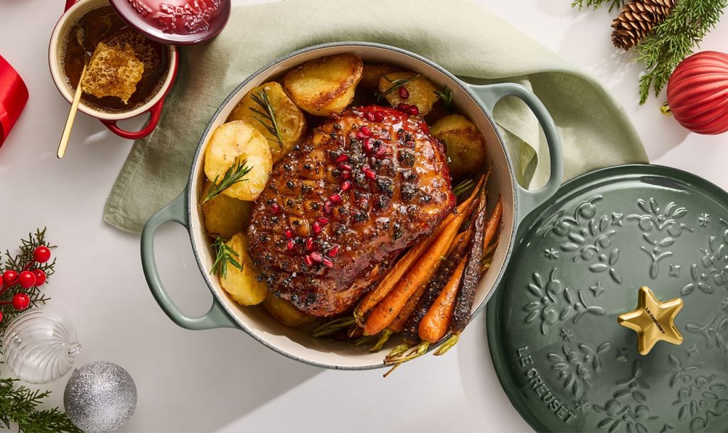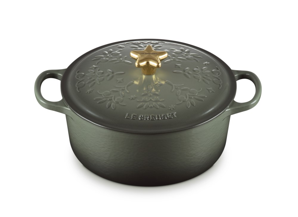 Бренд Le Creuset представил новую рождественскую серию посуды Couronne Enchantée в цвете «тимьян». В серию вошли регулярные эмалированные формы из чугуна и керамики. Посуда украшена тиснением в виде ели. Крышку кастрюль дополняет ручка в форме звезды.