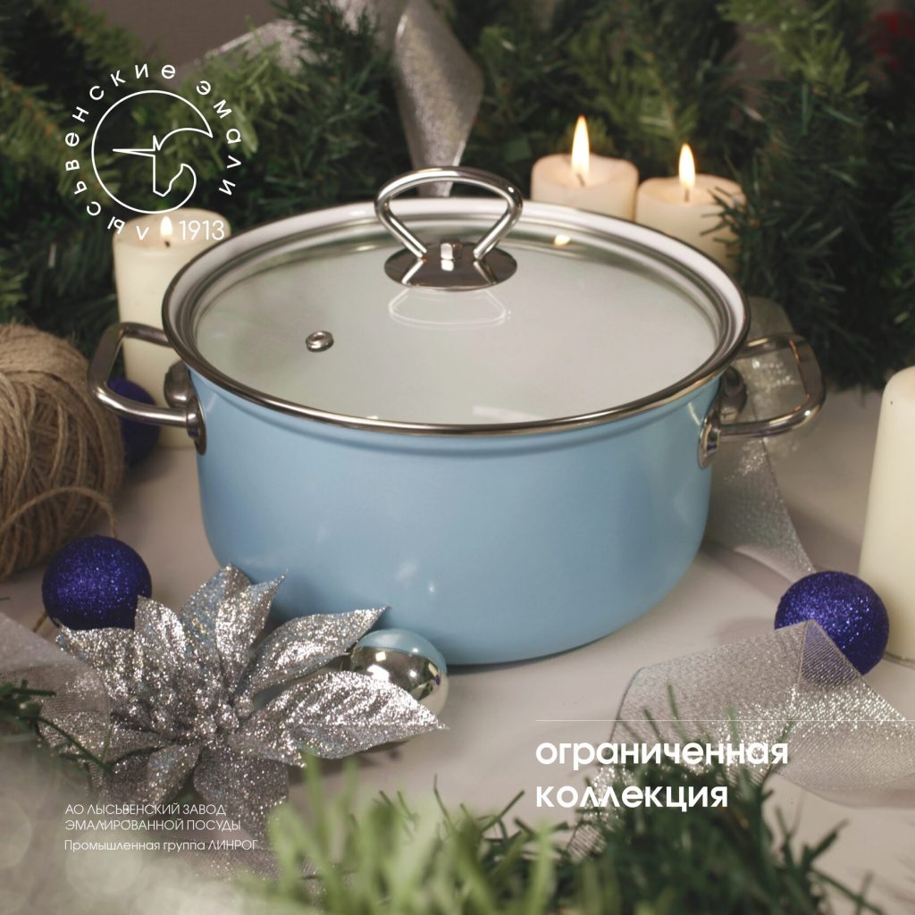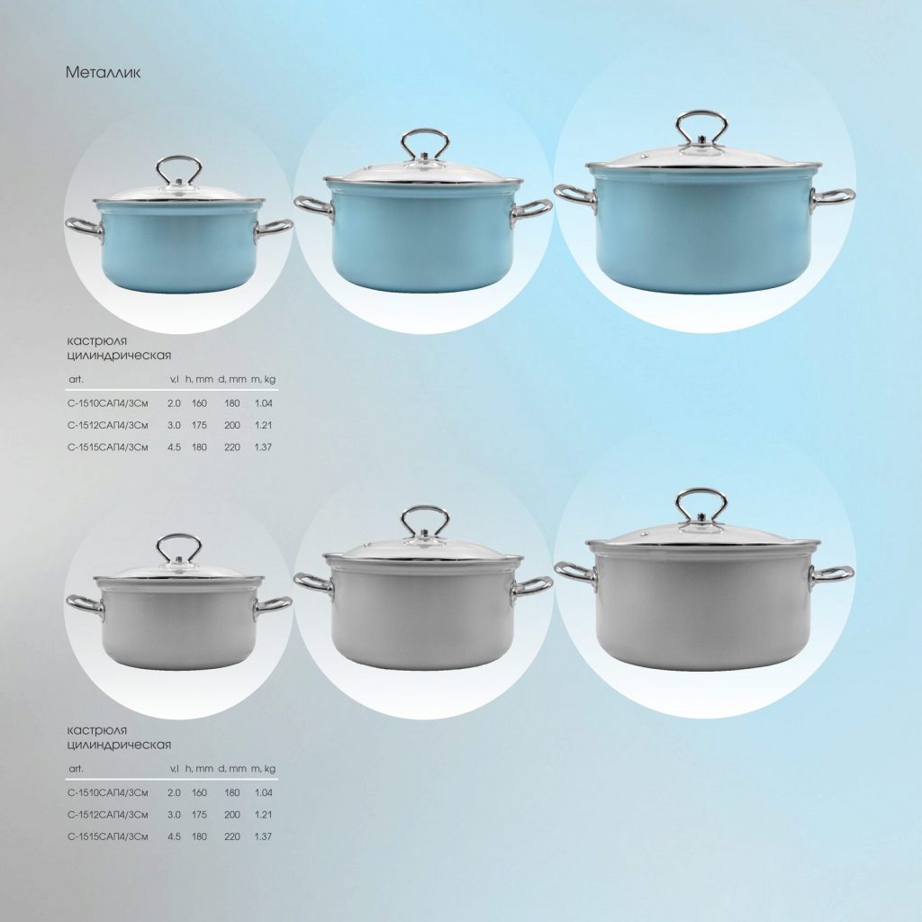 Лысьвенский завод эмалированной посуды выпустил лимитированную линейку цилиндрических кастрюль с крышками. Серия «Металлик» представлена в двух цветовых решениях: голубом и сером. Посуда изготовлена из эмалированной стали со стеклянными крышками и металлическими ручками. В ассортименте три размера объемом 2, 3 и 4,5 литра.