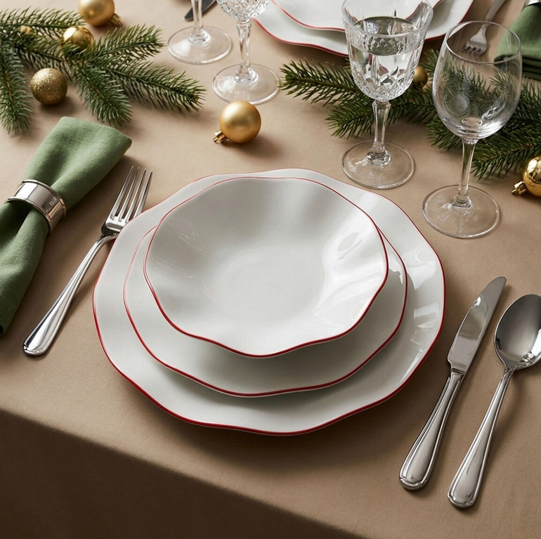 Турецкий производитель Güral Porselen выпустил коллекцию Red Glow для сервировки новогоднего стола. Набор выполнен из костяного фарфора bone porcelain, который отличается легкостью и прочностью при внешней хрупкости. Серия включает 12 предметов на 4 персоны: глубокие тарелки, десертные и сервировочные.