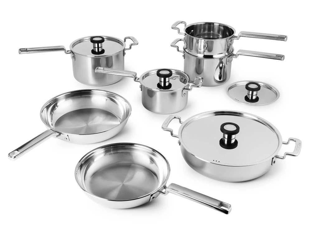Британский бренд Robert Welch выпустил новую коллекцию посуды из нержавеющей стали 316. В коллекцию входят штабелируемые сотейники, сковороды, воки и низкая кастрюля. Также доступны специальные вставки для приготовления на пару. Посуда подходит для всех типов плит, включая индукционные.