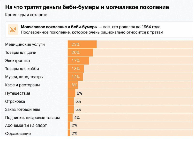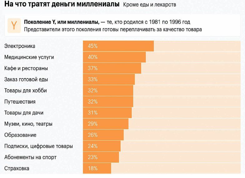 Что? По данным ВЦИОМ, кроме ежедневных обязательных расходов на еду и лекарства, это поколение с удовольствием тратит средства на кафе и рестораны — об этом заявили 49% опрошенных, на покупку электроники — 46% и заказ еды — 45% респондентов.
