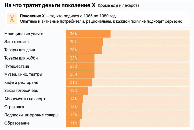 Что? В основном поколение X тратит деньги на медицину и обязательные платежи. Об этом заявили 88,4 и 82,7% опрошенных соответственно. Также они много путешествуют, посещают музеи и театры, отмечают праздники в ресторанах. Не чужды и покопаться в саду и огороде, заняться любимым занятием (29 и 23% соответственно).