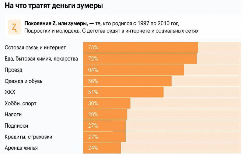 По результатам исследования, для 73% российских зумеров важнейшие ежемесячные траты — это сотовая связь и Интернет. 72% респондентов считают основной статьей расхода траты на товары повседневного спроса: продукты питания, бытовую химию, лекарства и товары для животных.