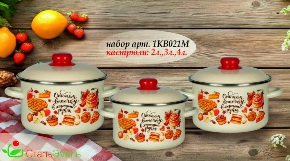Компания «Стальэмаль» выпустила новый набор посуды с рисунком «Выпечка». В набор входят три кастрюли разного объема с крышками. Корпус кастрюль изготовлен из стали с эмалевым покрытием.