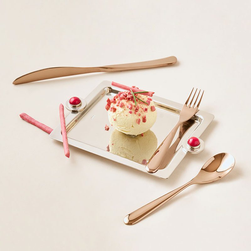 В сети магазинов «Евродом» появился набор столовых приборов Herdmar Century на 6 персон (24 предмета) в медном исполнении. Серия создана британским дизайнером Робином Левиеном как дань столетней истории бренда: силуэт сочетает прямые линии с мягкими закруглениями. Приборы выполнены из стали хромоникелевого сплава (18% хрома, 10% никеля) с антикоррозийными свойствами и дополнены фирменным клеймом на каждом приборе.