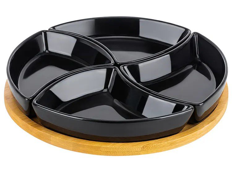 В компании «Элан Галерея» пополнен ассортимент менажниц их фарфора. Среди новинок — менажница «Айсберг» в комплекте из 4 фигурных ёмкостей объёмом 180 мл и вращающейся бамбуковой подставки. Фарфоровые секции снимаются, подходят для посудомойки и микроволновки.