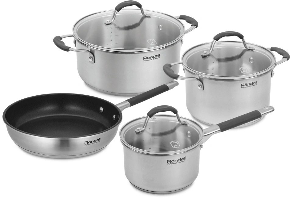 В наборе посуды Rondell Filigran вы найдете все самое необходимое: 2 кастрюли различного объема (3,9 л/4,7 л) и ковш (1,9 л) с крышками, а также сковороду диаметром 26 см. Все изделия выполнены из высококачественной нержавеющей стали 18/10. Ручки посуды оснащены силиконовыми накладками. Кастрюли поставляются с крышками из термостойкого стекла. Сковорода имеет стойкое антипригарное покрытие Silkware. Набор совместим со всеми типами плит, включая индукционные.