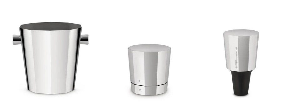 Итальянский бренд Alessi дополнил коллекцию барного стекла Eugenia аксессуарами: кулером из нержавеющей стали и стопперами для бутылок шампанского и вина. Стопперы оснащены силиконовыми вставками для лучшей герметичности. Дизайнер Наото Фукасава воплотил форму с тупыми углами Donkaku, ставшую формальной характеристикой всего набора.