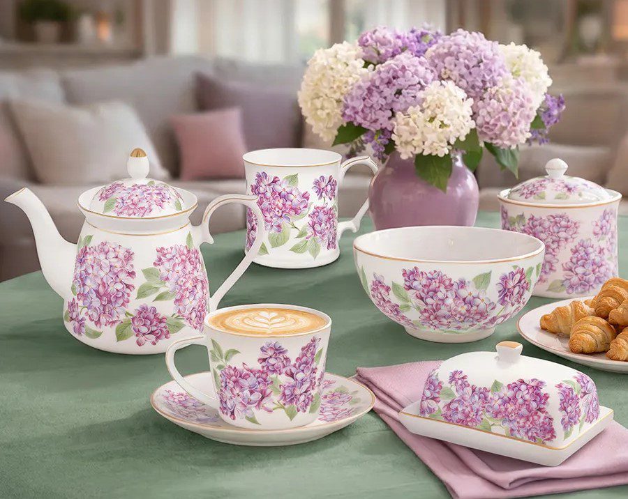 Компания «Элан Галерея» представила новую коллекцию столовой посуды с деколью «Сирень». Изделия выполнены из белого фарфора с золотым окаймлением. Прорисованные детали и мягкая палитра фиолетовых оттенков передают очарование цветущей сирени. Коллекция представлена посудой для уютного чаепития и красивой сервировки блюд и закусок.