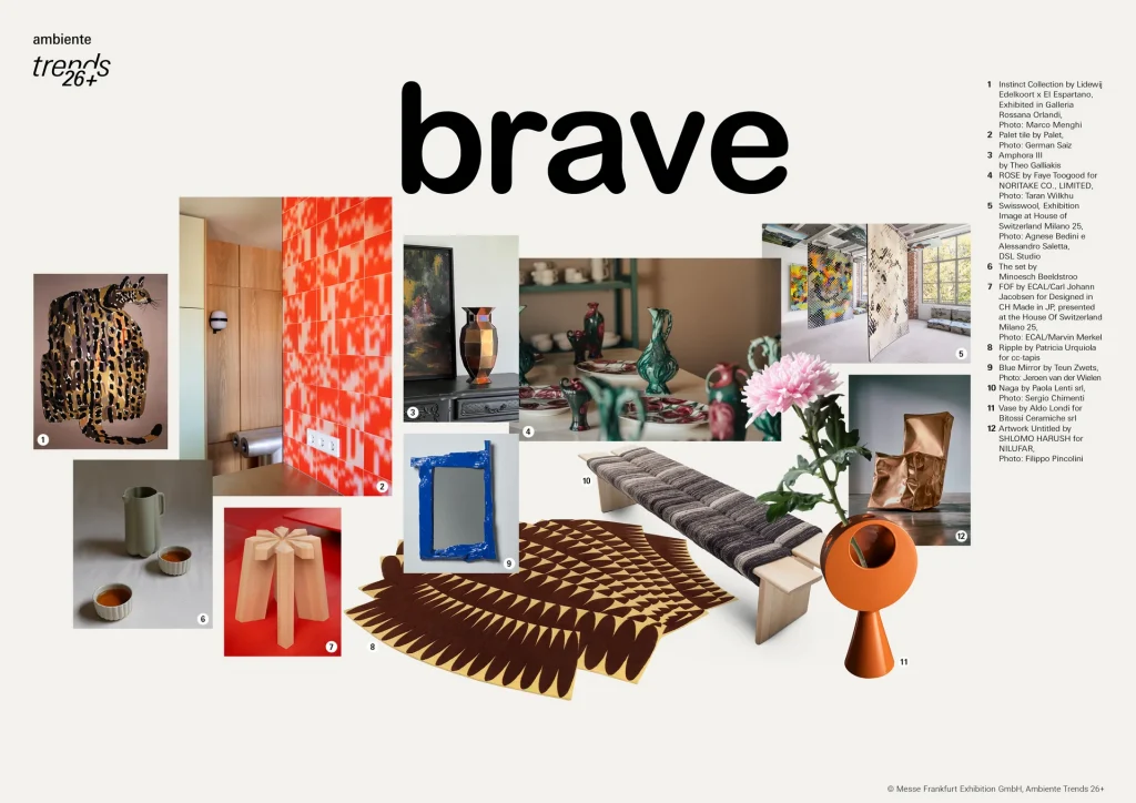 Brave — про смелость и дифференциацию. Контрасты материалов, сочетание ремесла и технологий, выразительные формы и активный декор. Для закупщиков это сигнал: в ассортименте должны быть «якорные» позиции, которые привлекают внимание и формируют образ категории, даже если они не дают основной оборот.