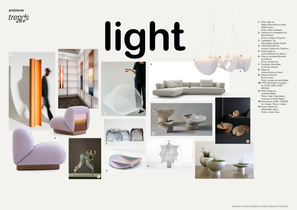 Light — ответ на запрос на лёгкость и визуальное спокойствие. Прозрачные и «текучие» материалы, пастельные оттенки, светлые поверхности. Этот тренд хорошо масштабируется в среднем ценовом сегменте и работает как универсальный фон для lifestyle-ассортимента.
