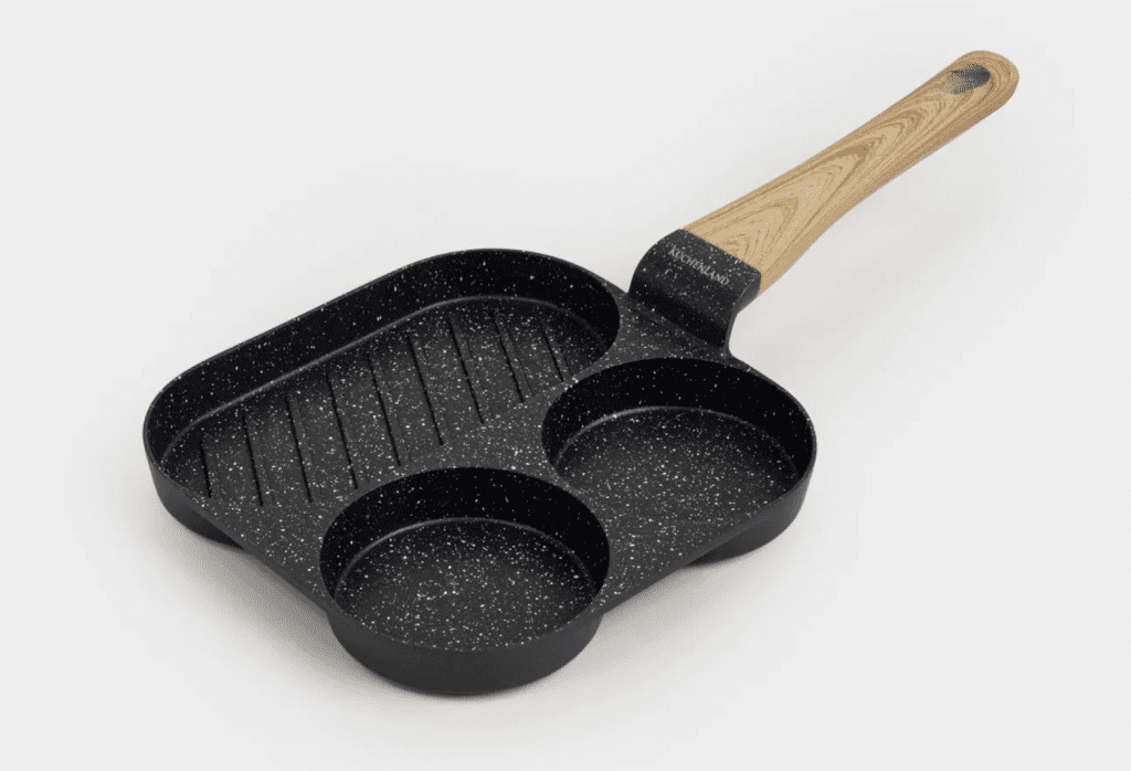 Ассортимент сети Kuchenland пополнился сковородой-гриль с 3-мя отделениями. Корпус — литой алюминий c двухслойным антипригарным покрытием Pfluon cookmark. Имеет гладкую поверхность, которая позволяет готовить с минимальным количеством масла и выдерживает длительный нагрев до 230ºС (на короткое время можно нагревать до 250ºС); обладает высокой теплопроводностью, износостойкостью и устойчивостью к царапинам. Ручка — бакелит. Сковорода подходит для всех типов плит, в том числе индукционных.