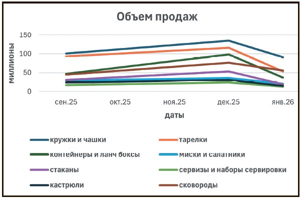 А возвращаясь к началу данного материала, подчеркнем, что январские продажи предметов посуды не оправдали больших ожиданий (продажи были невысокими и даже ниже показателей прошлого года), хотя с сентября 2025 года повышение уровня продаж все же было.