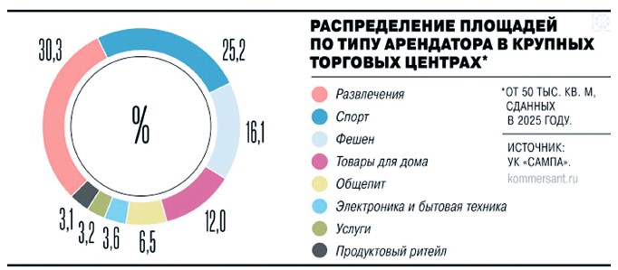 Сегодня распределение площади в торговых комплексах складывается не в пользу торговли, а в пользу сферы платных услуг. Первые места занимают сфера развлечений и спорта – 30,3% и 25,2% от общего метража соответственно.