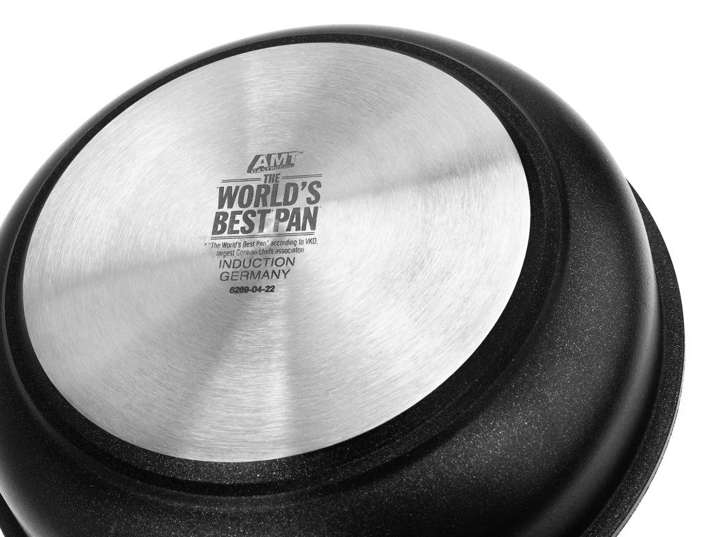 Немецкий бренд посуды премиум-качества AMT Gastroguss начал использовать модернизированную технологию крепления индукционного слоя. Теперь дно сковороды представляет собой цельный стальной диск по всей площади: абсолютно ровный, без узоров и вырезов. Изменение устраняет потемнение дна от моющих средств, повышает энергоэффективность и совместимость со всеми типами плит. Оригинальность продукции можно определить по маркировке: она включает логотип и название бренда, номер партии, месяц и год изготовления.
