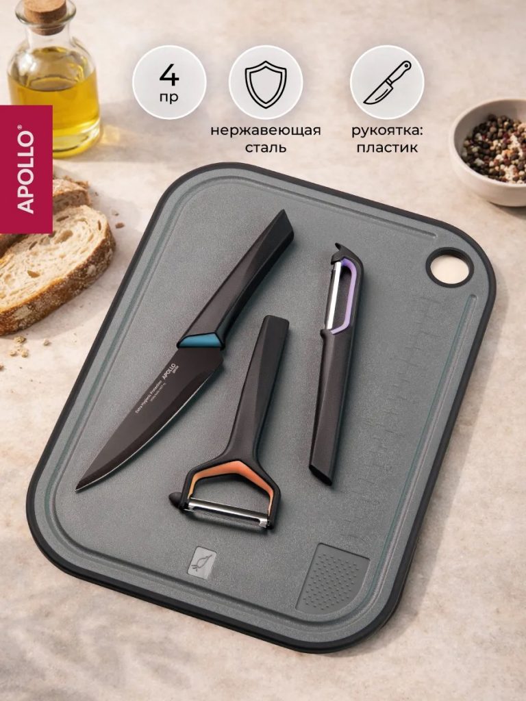 Ассортимент ТМ Apollo пополнился набором кухонных инструментов. В него вошли: доска разделочная, картофелечистка, овощечистка и универсальный нож. Все изделия выполнены из качественных материалов: нержавеющая сталь 3Cr14 и пищевой пластик. Разделочная доска оснащена противоскользящей вставкой для устойчивости и зоной для измельчения чеснока.