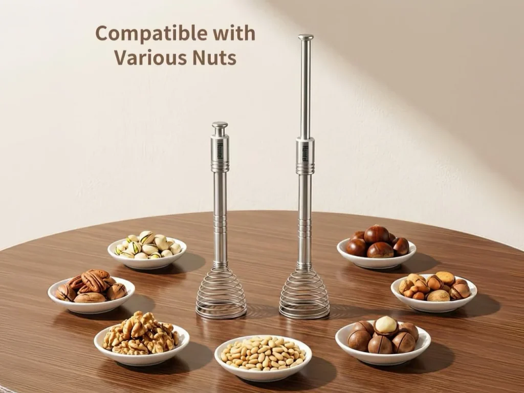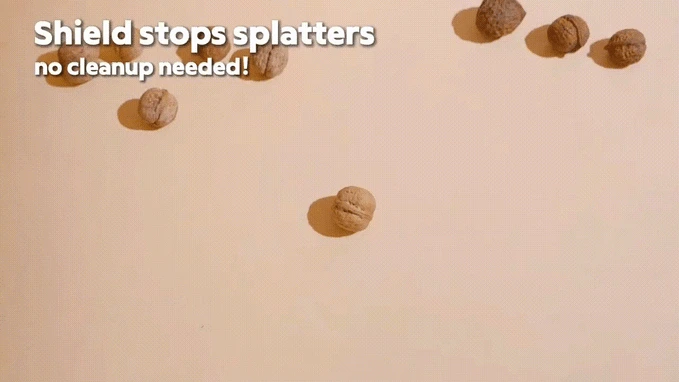 Инновационный орехокол с вольфрамовым наконечником HRC60+ от дизайн-бюро Hamtel (Гонконг) легко раскалывает грецкие и бразильские орехи, справляется с клешнями крабов и лобстеров. Его основной функцией является пружинный ударный механизм, который с точностью колет орехи, сохраняя ядро и порядок на столе. Корпус из нержавеющей стали с пружиной из марганцевого сплава генерирует удар >530 м/с при нажатии.