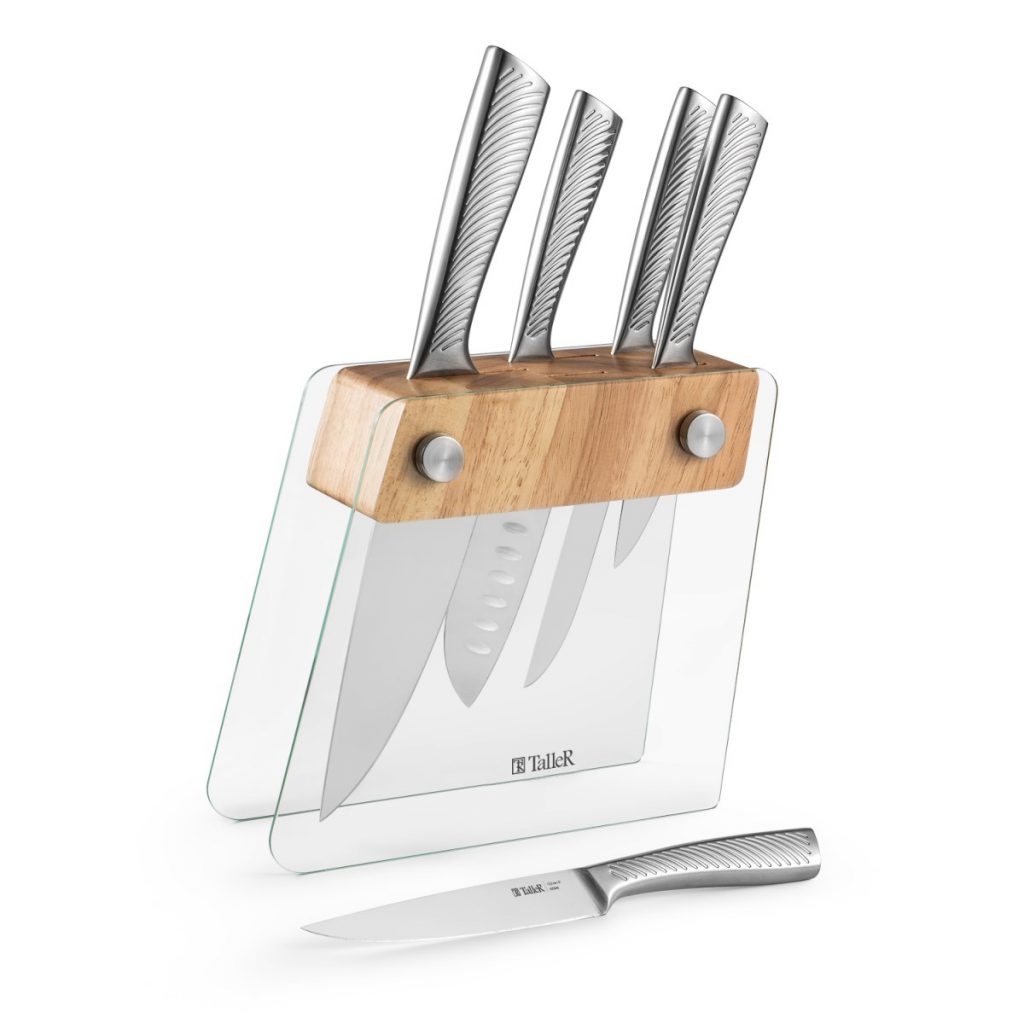 Торговая марка TalleR представила набор ножей «Эксперт» (TR-22040). Комплект включает 5 ножей и стильную подставку из закаленного стекла со вставками из гевеи. Лезвия ножей выполнены из коррозионностойкой стали 3Cr13. Рукоятки из усиленного пластика гарантируют надежный хват.